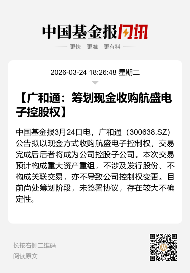 3月24日晚间,广和通发布公告称,公司正在筹划以现金方式收购深圳市航盛电子股份有限公司(以下简称航盛电子)控制权,预计构成重大资产重组。