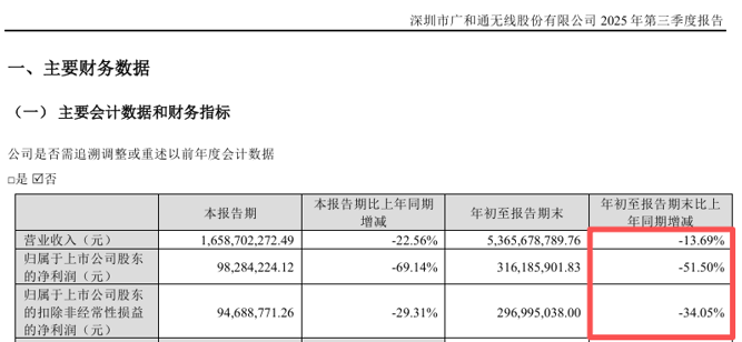 2025年前三季度,广和通的营业收入为53.66亿元,同比下降13.69%;归母净利润为3.16亿元,同比下降51.50%。