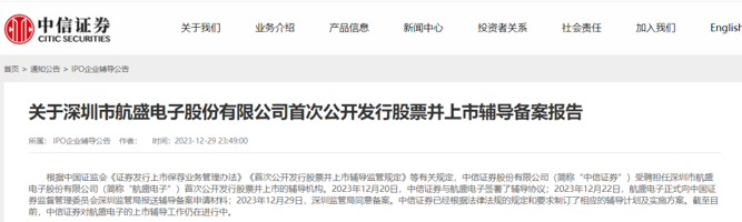 中信证券官网显示,2023年12月20日,中信证券与航盛电子签署辅导协议;2023年12月22日,航盛电子正式向深圳证监局报送辅导备案申请材料;2023年12月29日,深圳证监局同意备案。