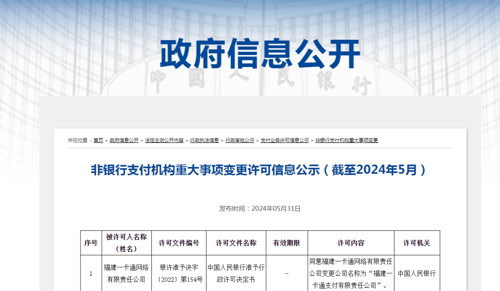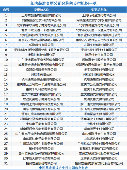 公示信息还显示,共有31家支付机构的更名申请获批。