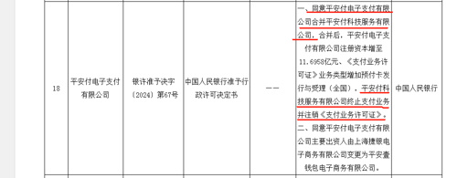 公示信息显示,央行已同意平安付电子支付有限公司合并平安付科技服务有限公司。