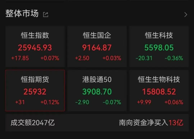 南向资金今日净流入13亿港元。盘面上,新消费概念迎政策利好;大型科技股走势分化,恒生科技指数最终收跌;部分B类医药股走高,创新药板块活跃;有色板块继续受益于美联储降息预期升温。