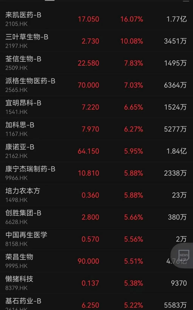 港股创新药板块回暖,B类股来凯医药、三叶草生物、荃信生物、派格生物医药分别上涨16.07%、10.08%、7.83%、7.03%。