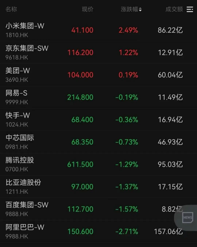 小米集团、京东集团、美团分别上涨2.49%、1.22%、0.19%,阿里巴巴、百度集团、腾讯控股分别下跌2.71%、1.57%、1.29%。