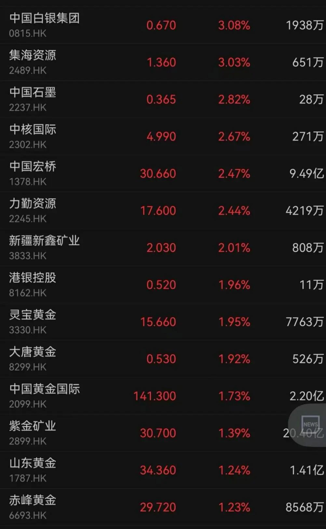中国白银集团、集海资源、中国石墨分别上涨3.08%、3.03%、2.82%,灵宝黄金、大唐黄金、中国黄金国际分别上涨1.95%、1.92%、1.73%。