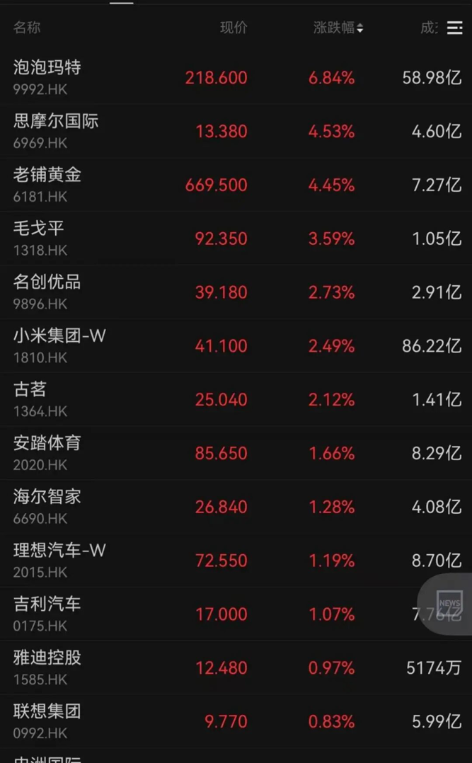 泡泡玛特涨超6%,老铺黄金、毛戈平、名创优品等分别上涨4.45%、3.59%、2.73%。