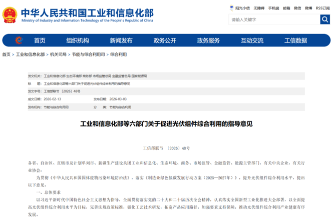 3月3日,工业和信息化部等六部门发布《关于促进光伏组件综合利用的指导意见》(以下简称《意见》)。