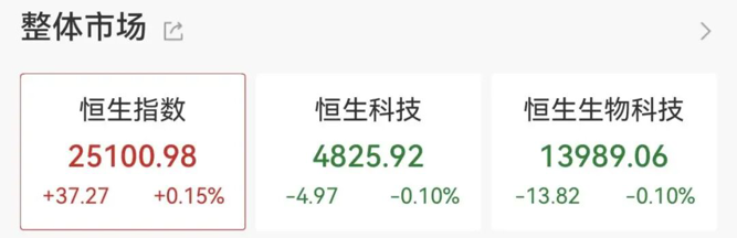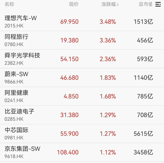 港股市场同样震荡回落,恒指涨幅收窄至0.15%;恒生科技指数转跌,此前一度涨近2%。个股方面,理想汽车、同程旅行、蔚来等涨幅居前。