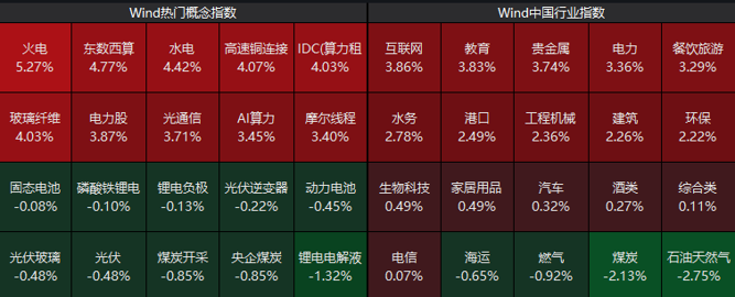 板块上来看,绿电板块强势走高,贵金属、餐饮旅游、算力等方向涨幅居前;而石油天然气、煤炭、光伏等板块震荡调整。个股方面,超4500只个股上涨。