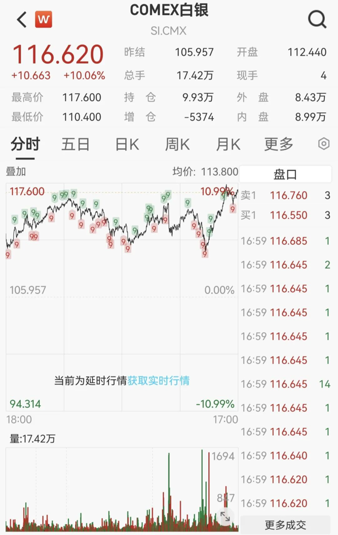 COMEX白银期货涨10.06%,报116.62美元/盎司。