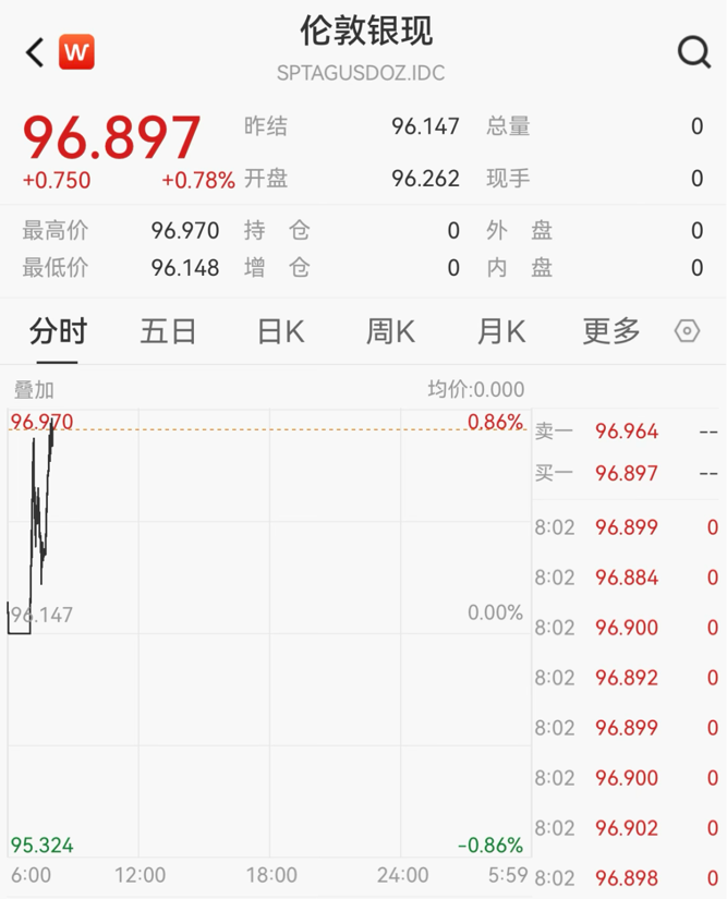 白银方面,现货白银首次突破96美元!最高价报96.97美元/盎司,创历史新高。