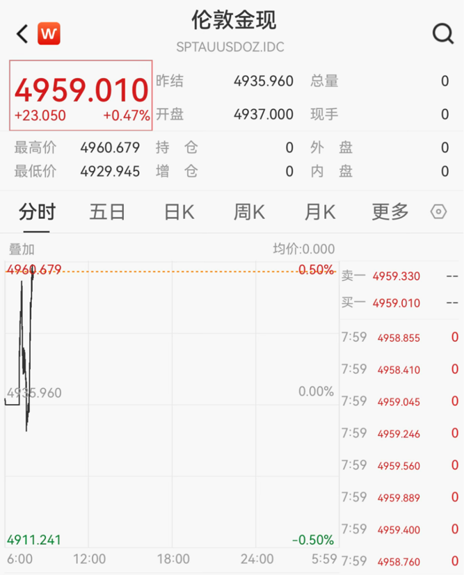 今早7点半左右,现货黄金直线冲高,站上4960美元,再创历史新高。