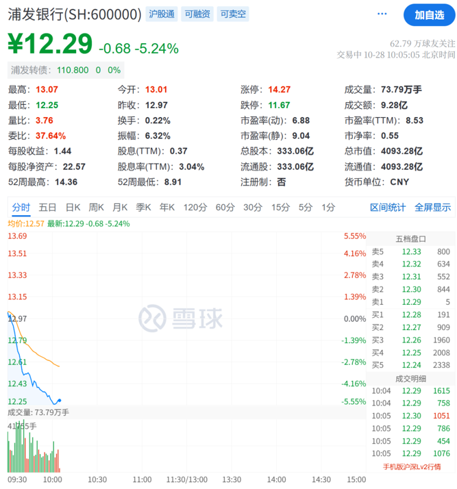 10月28日上午,银行股快速走低。浦发银行直线跳水,盘中跌超5%。