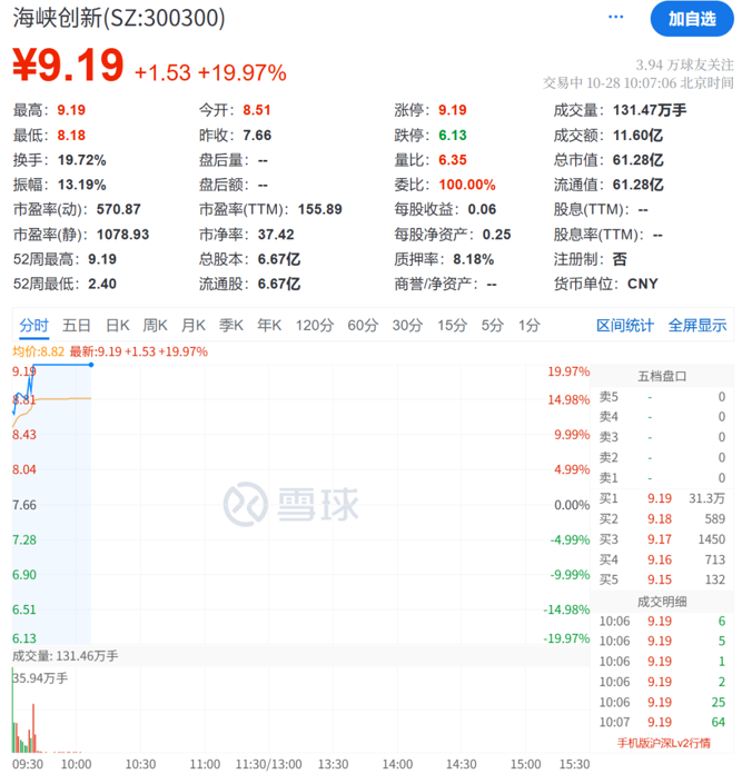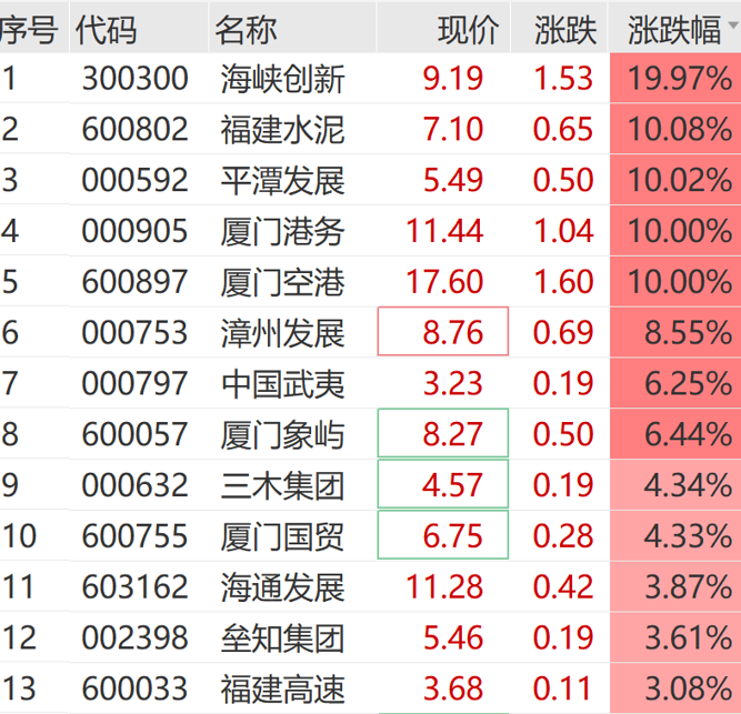 10月28日上午,福建本地股持续走强,海峡创新开盘后迅速封板,连续2日拉出20cm涨停。平潭发展8日6板,福建水泥2连板,厦门港务、厦门空港涨停,漳州发展、中国武夷等跟涨。