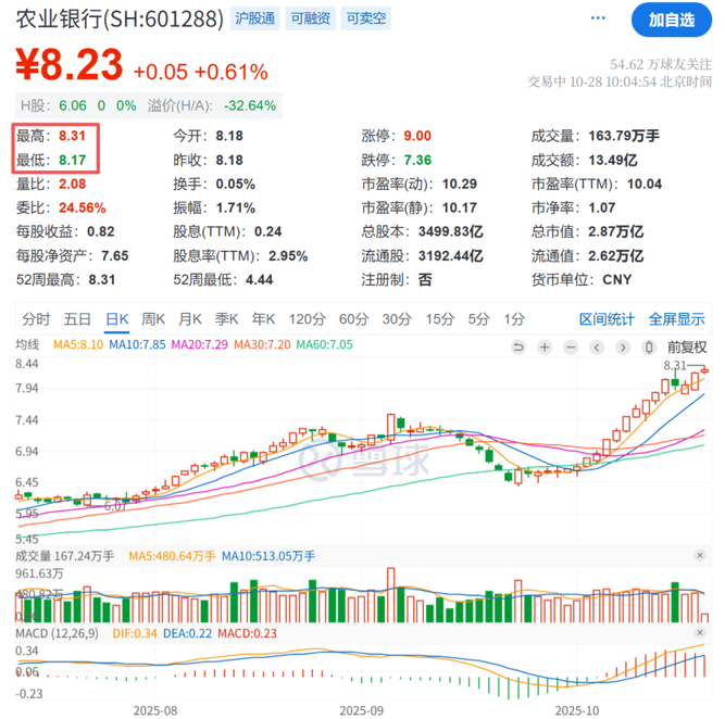 农业银行盘中股价最高达8.31元/股,涨幅为1.59%,股价再创历史新高。截至发稿,农业银行股价亦有所回调。