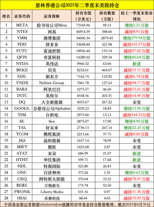 私募巨头景林资产的海外子公司景林资产管理香港有限公司(以下简称景林香港公司),8月8日晚间向美国证券交易委员会(SEC)提交了截至2025年二季度末的美股持仓数据。