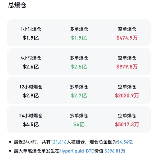 CoinGlass数据显示,过去24小时加密货币市场共有超12万人被爆仓,爆仓总金额为4.54亿美元,其中多单爆仓4亿美元,空单爆仓5017.3万美元。