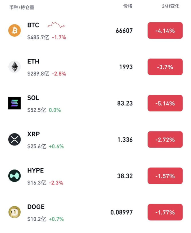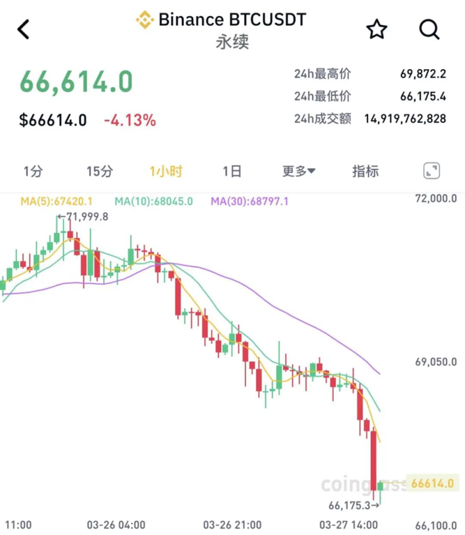 3月27日晚间,比特币跌破67000美元/枚,过去24小时内跌幅超4%;以太坊跌至1993美元/枚,过去24小时内跌3.7%。