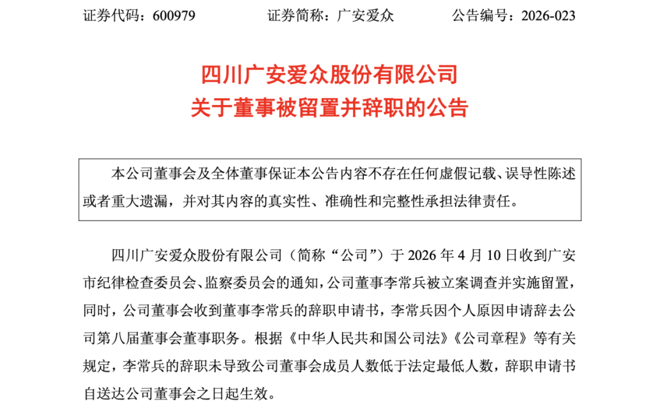 4月10日,广安爱众发布公告称,公司董事李常兵被立案调查并实施留置。同时,李常兵因个人原因申请辞去公司第八届董事会董事职务。