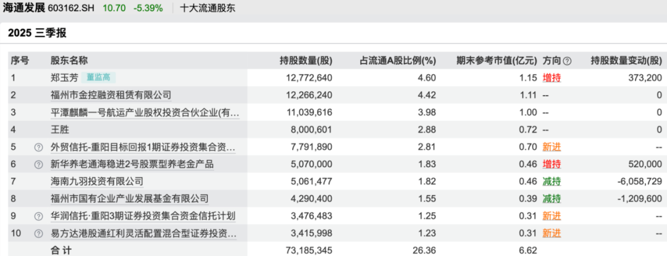 老牌私募机构重阳投资在今年三季度新进了海通发展,重阳目标回报1期、重阳3期分别持有779.19万股、347.65万股,期末持股总市值为1.01亿元。