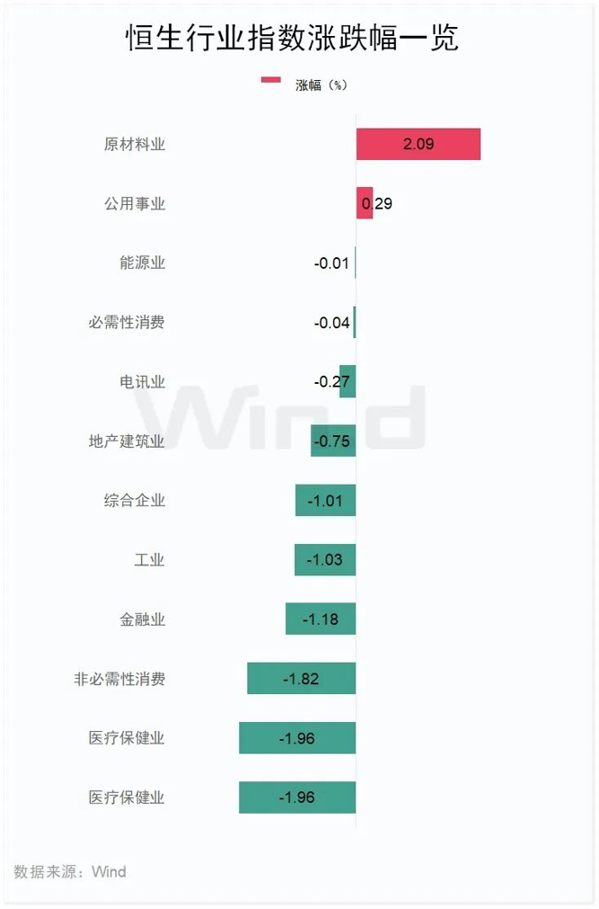 香港恒生行业指数中,原材料业指数上涨2.1%,公用事业指数上涨0.3%;跌幅方面,医疗保健业指数下跌2.0%,资讯科技业指数下跌2.0%,非必需性消费行业指数下跌1.8%。