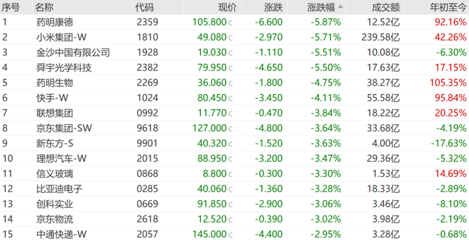恒生指数成分股中19只上涨,63只下跌。药明康德下跌5.87%,小米集团下跌5.71%,金沙中国有限公司下跌5.51%,领跌蓝筹。