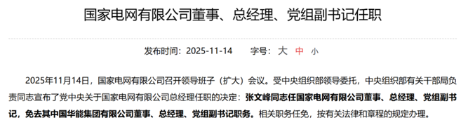 国家电网官方网站11月14日发文称,2025年11月14日,国家电网有限公司召开领导班子(扩大)会议。受中央组织部领导委托,中央组织部有关干部局负责同志宣布了党中央关于国家电网有限公司总经理任职的决定:张文峰同志任国家电网有限公司董事、总经理、党组副书记,免去其中国华能集团有限公司董事、总经理、党组副书记职务。相关职务任免,按有关法律和章程的规定办理。