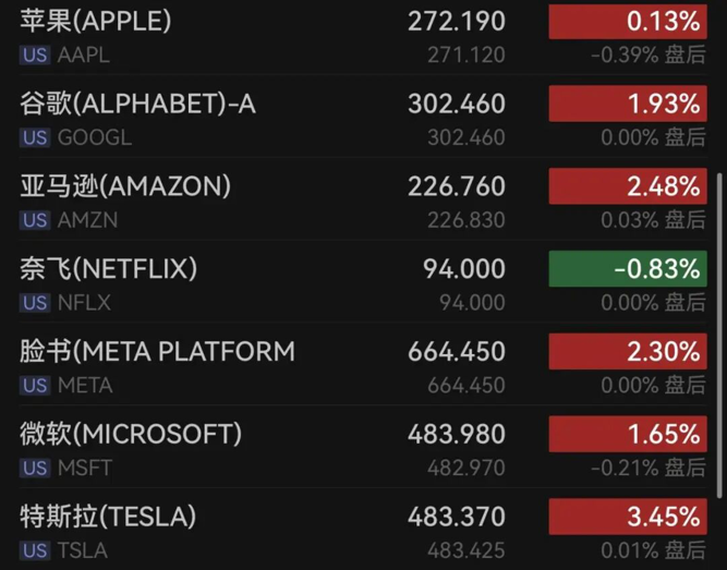 大型科技股集体上涨。特斯拉涨超3%,亚马逊、脸书涨超2%,谷歌、英伟达涨近2%,微软涨超1%,苹果涨0.13%。