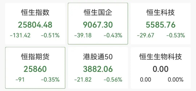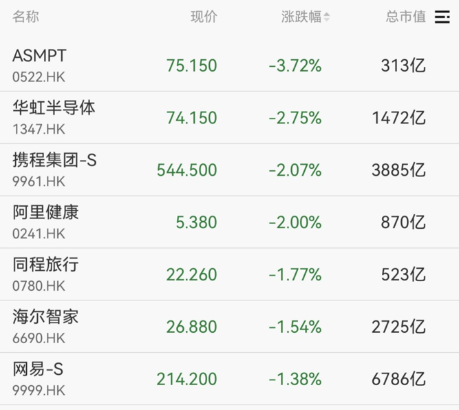 港股主要指数走低,恒生科技指数一度跌超1%,华虹半导体、携程集团、阿里健康跌幅居前。
