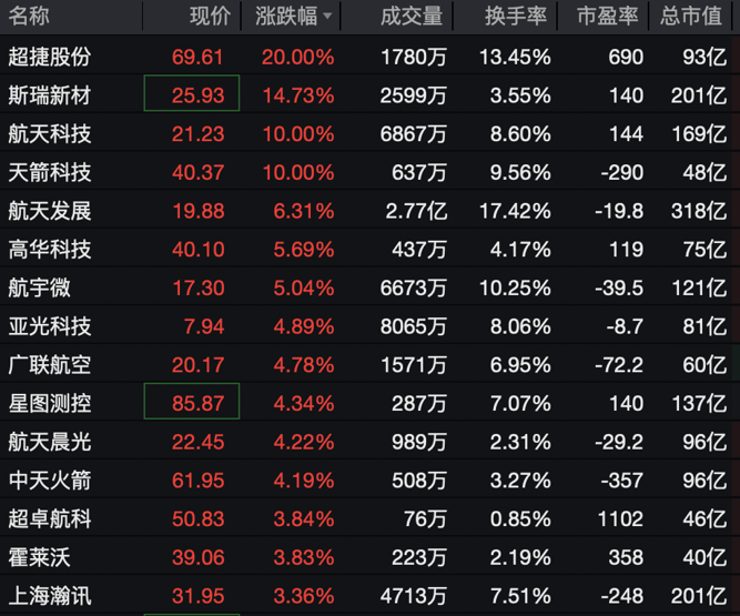 商业航天概念股早盘延续强势,超捷股份20%涨停,航天科技、天箭科技直线拉涨停,斯瑞新材、航天发展、高华科技等跟涨。