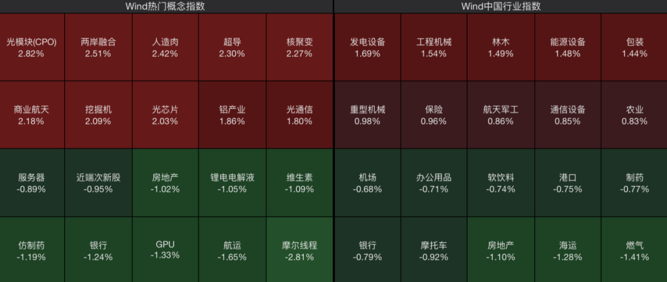 从板块上来看,商业航天、CPO、福建板块走强;而GPU、燃气、房地产等板块震荡走低。
