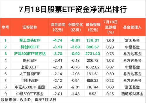 【导读】7月18日股票ETF净流出近40亿元,资金选择“落袋为安”