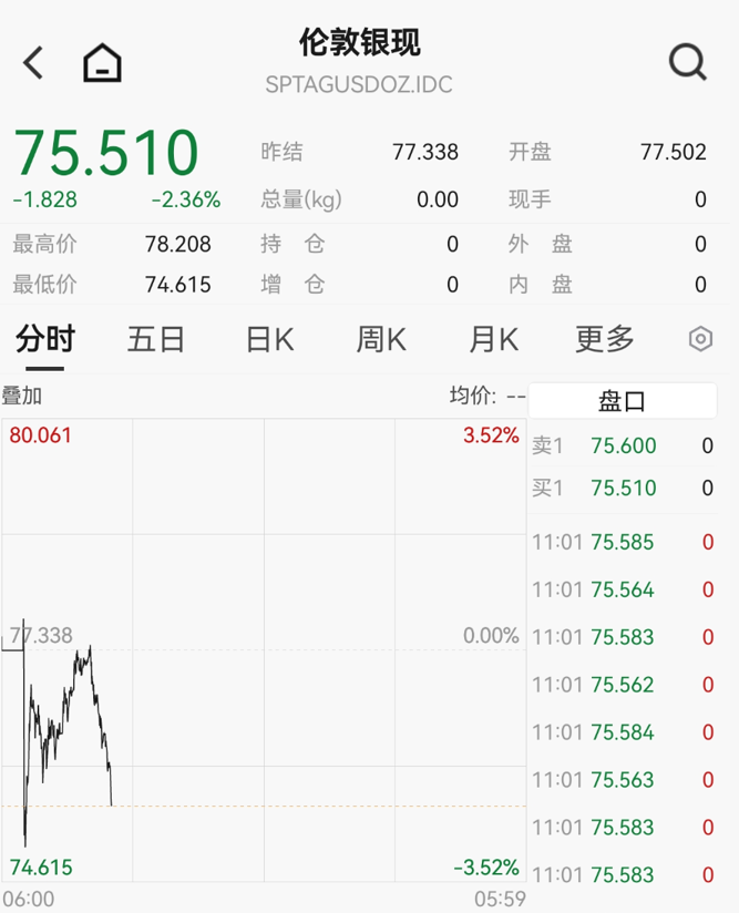 白银现货早间一度跌超3%,跌至75美元/盎司以下。短线拉升后,现货白银价格再度下挫,截至发稿跌超2%。