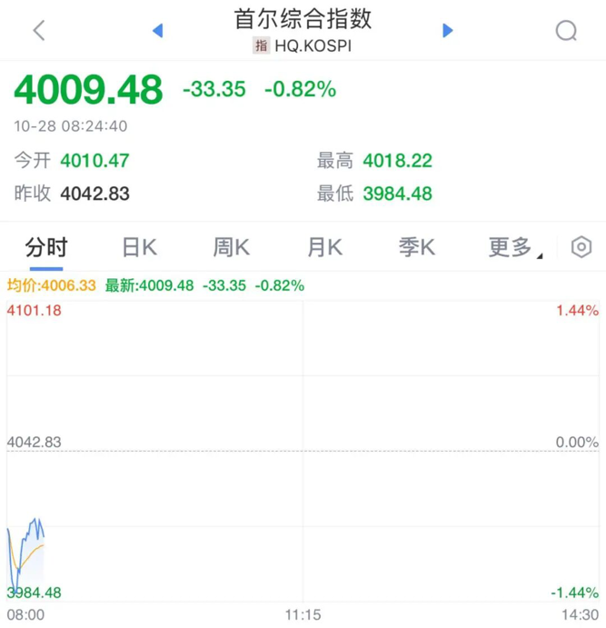 韩国综合股价指数开盘下挫,一度跌超1%,随后震荡拉升。