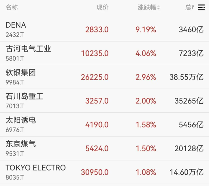 个股方面,软银集团、东京煤气、东京电子等率先拉升。
