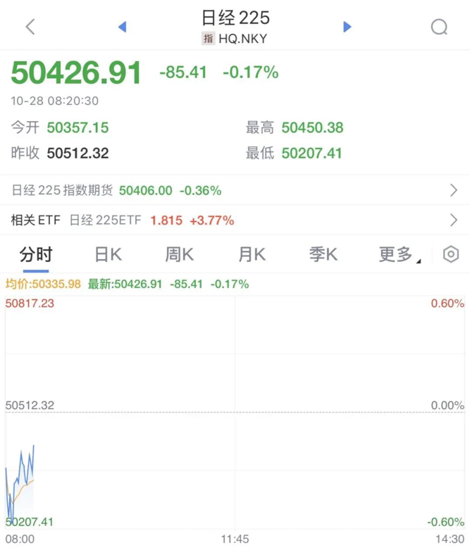 日经225指数上午开盘报50357.15点,跌幅为0.31%。
