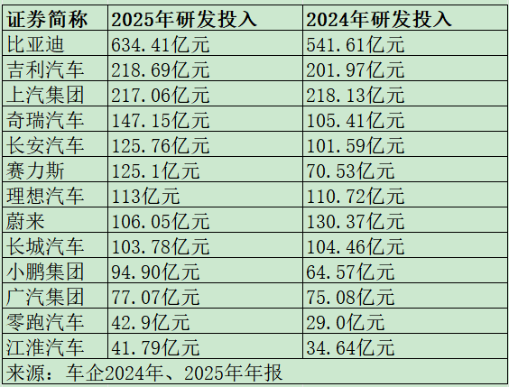 数据正在印证车企的竞争转向。2025年,头部车企的研发投入大都迈过百亿级门槛,其中比亚迪、吉利汽车、上汽集团分列前三。