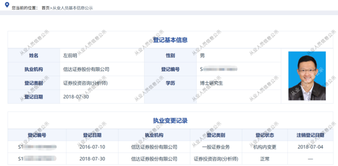 中国证券业协会登记信息显示,左前明为博士研究生学历,2016年7月在信达证券首次进行执业登记,2018年7月登记类别由“一般证券业务”变更为“证券投资咨询(分析师)”,目前登记状态正常。