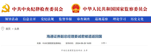 【导读】海通证券副总经理姜诚君被遣返回国