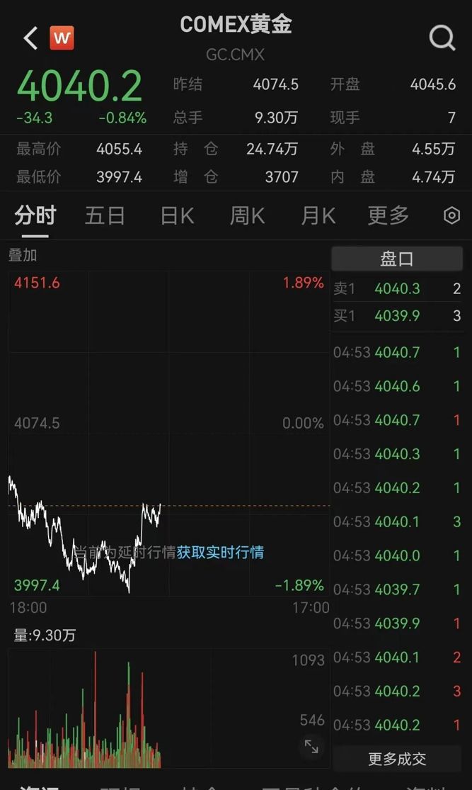 COMEX黄金同样一度跌破4000美元/盎司,最大跌幅近1.9%。但随后也出现止跌回升,截至发稿报4040.2美元/盎司,跌幅收窄至0.84%。