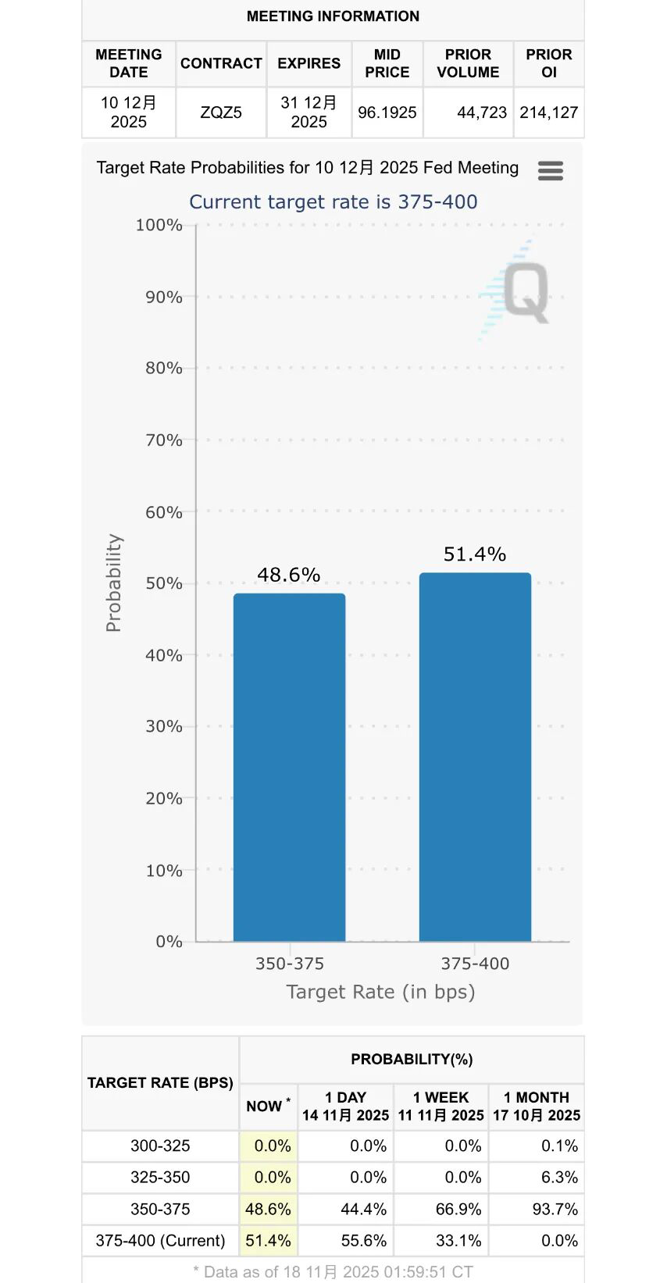 据CME“美联储观察”,美联储12月维持利率不变的概率大幅攀升,近期频频升至50%以上。而降息25个基点的概率已从一个月前的93.7%持续下降,降至48.6%。