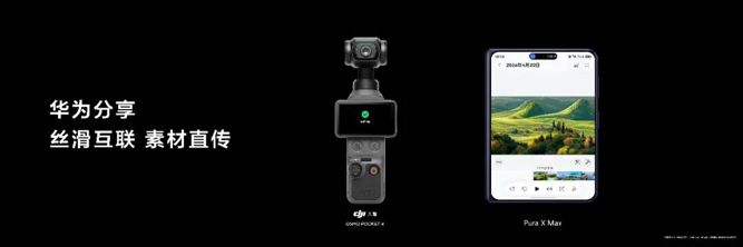 华为积极加强跨界合作。据余承东介绍,伴随鸿蒙星河互联再升级,华为Pura X Max支持与大疆Pocket 4设备直传,通过华为分享即可高速稳定传输视频、图片、动图等素材,高效衔接拍摄与创作。