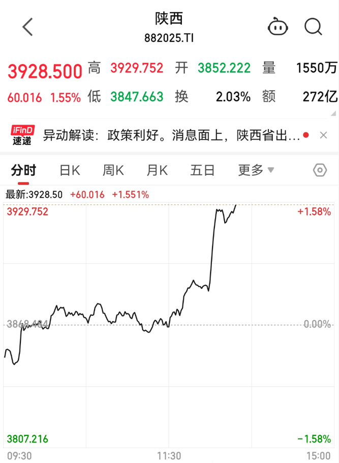 消息发布后,陕西板块整体异动拉升。