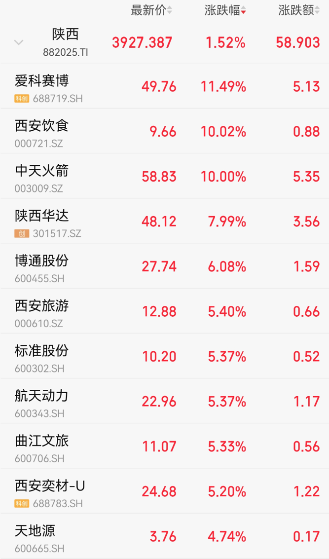 中天火箭直线拉涨停,西安饮食涨停后开板,西安旅游、曲江文旅、陕国投A、西部证券纷纷冲高。