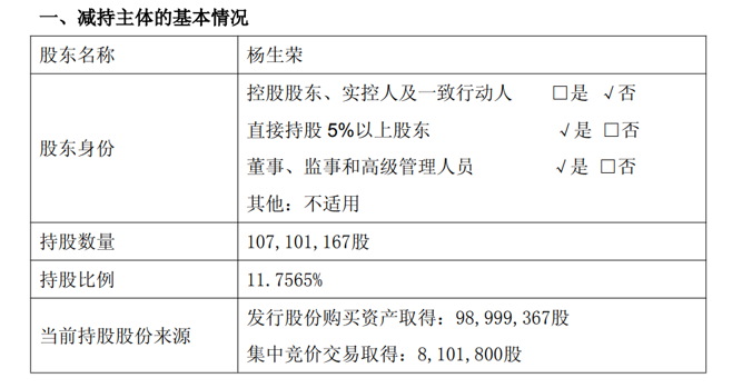 截至公告日,杨生荣持有公司1.07亿股(其中:无限售流通股8329.05万股,限售股2381.07万股),占公司总股本的11.76%。