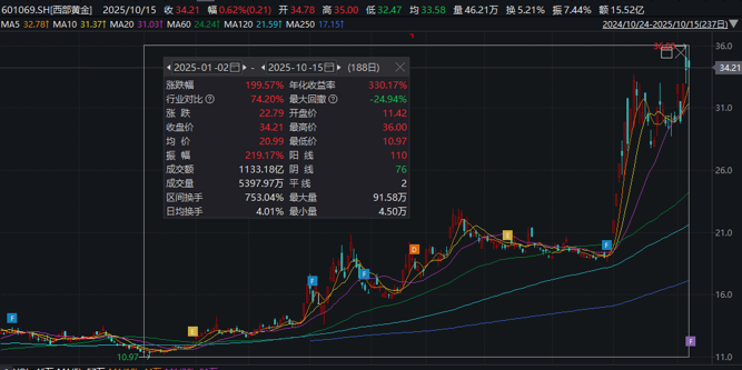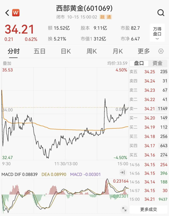 截至10月15日收盘,西部黄金股价报34.21元/股,总市值为312亿元。