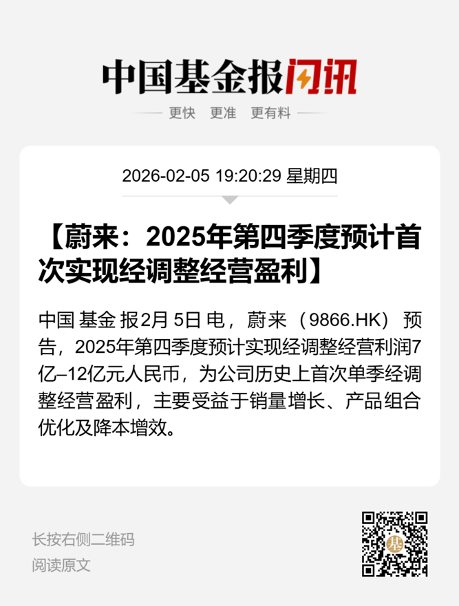 同时,蔚来公司按照公认会计准则计量,预计其2025年第四季度的经营利润约为2亿元至7亿元。