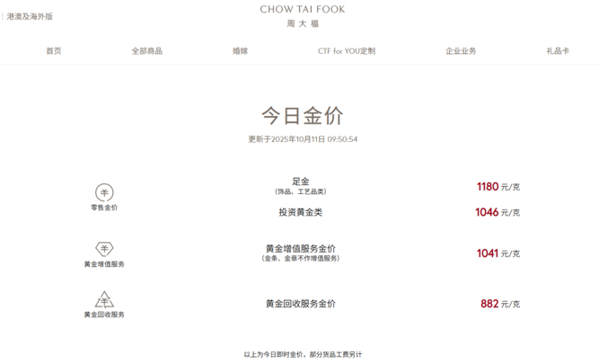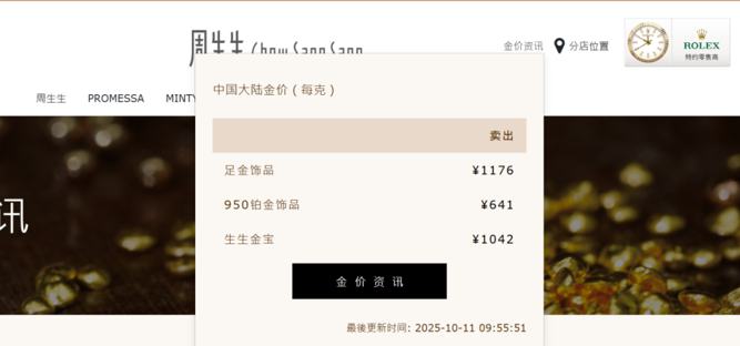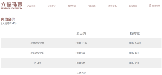周大福、六福珠宝足金饰品为1180元/克,周生生足金饰品为1176元/克,均有明显上涨。