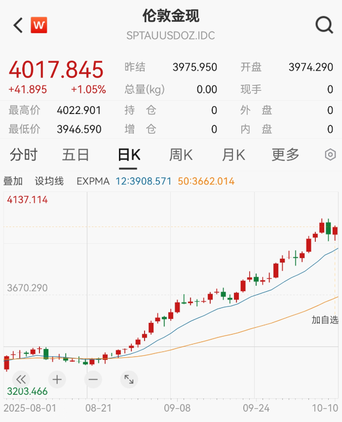 全球资产经历“惊魂夜”,唯有黄金“永不眠”。截至10月10日收盘,黄金现货报4017.845美元/盎司,涨1.05%,重回近期高位。