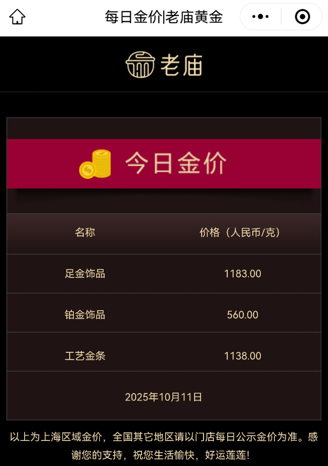 【导读】国际金价走高,国内品牌金饰价格飙涨,老庙黄金足金饰品报1183元/克
